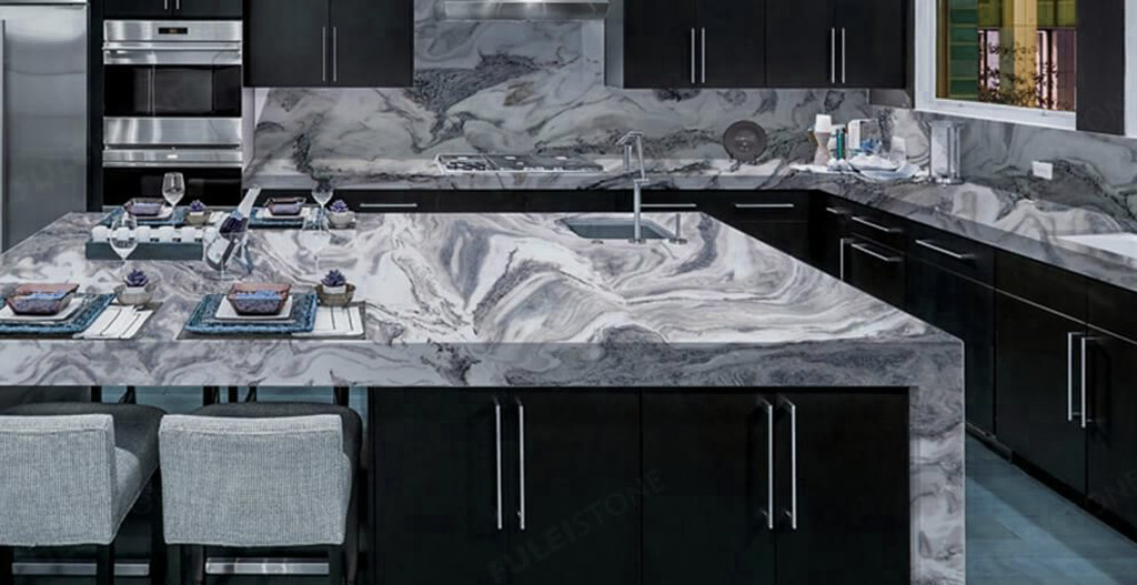 We could install marbles in many places. Expectedly, kitchen waterfall countertops are the first place many customers consider for the addition of marble.