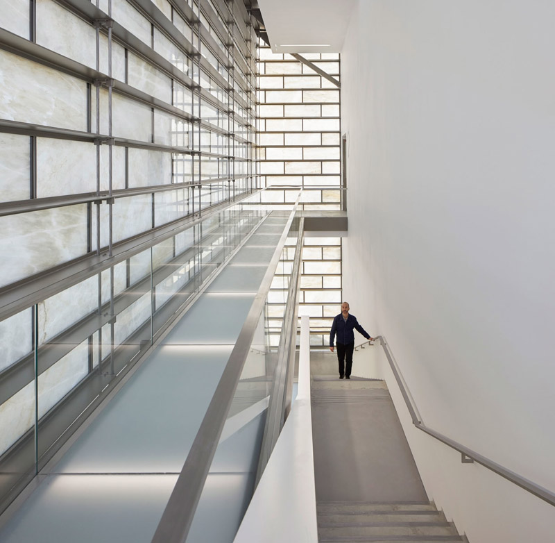 Marble can pass light through it. Of course, this depends on the thickness of the slab of stone. But the designers at Stanton Williams chose the exact measurements to allow light to travel through the stone. In the morning, the stone passes the light of the sun in the French city through it. At night, the backlit wall pushes the light into outer space. Therefore, the general idea is to play with light.